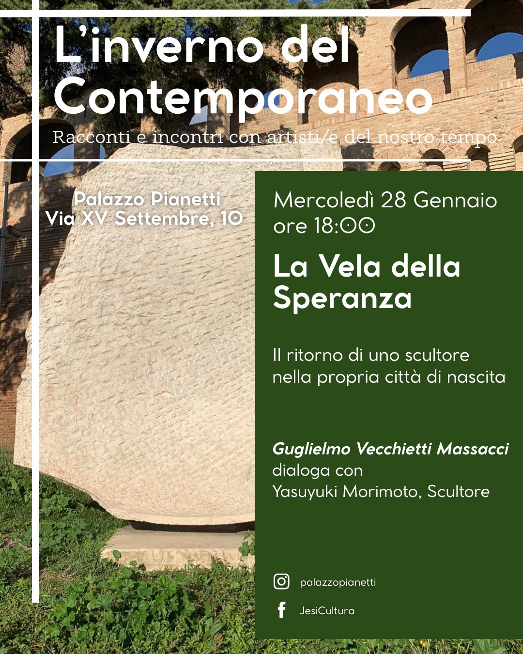 Dialogando con lo scultore Yasuyuki Morimoto, nel corso della serata l'artista ripercorrerà le principali tappe della sua carriera, presentando anche il recente restauro de "La Vela della Speranza", scultura posta all'ombra del Torrione di Mezzogiorno realizzata nel 1983 per la città di Jesi.